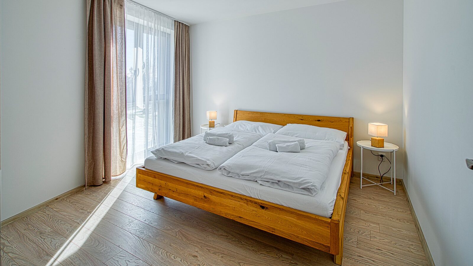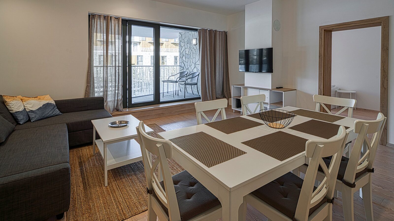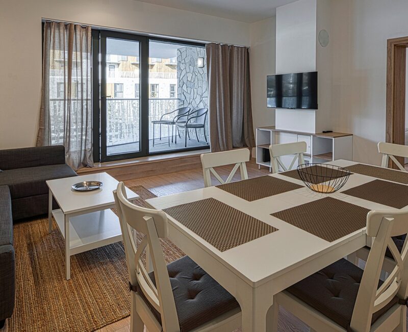 Apartmán JEDĽA, ktorý sa nachádza na 2. poschodí apartmánového domu, je ideálny pre 6 dospelých osôb. Súčasťou apartmánu je spálňa, izba s 2 jednolôžkovými posteľami, ktoré je možné rozložiť na 2 samostatné postele, obývacia miestnosť s kuchyňou a kúpeľňa. Obývacia časť je vybavená TV, sedacou súpravou, jedálenským stolom a je prepojená s plne vybavenou kuchyňou, ktorá obsahuje varnú dosku, elektrickú rúru, chladničku, varnú kanvicu a umývačku riadu. Apartmán je vybavený terasou s výhľadom na štíty Vysokých Tatier a neobsahuje krb.