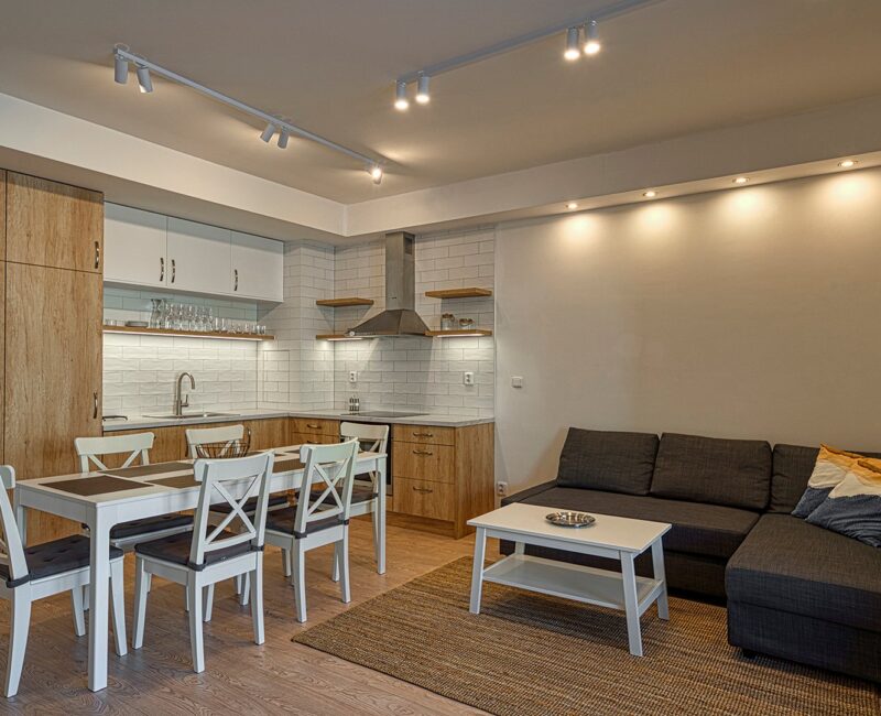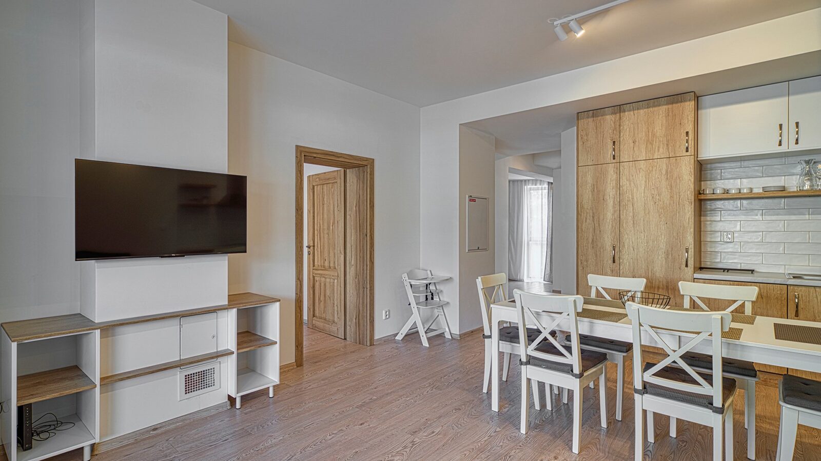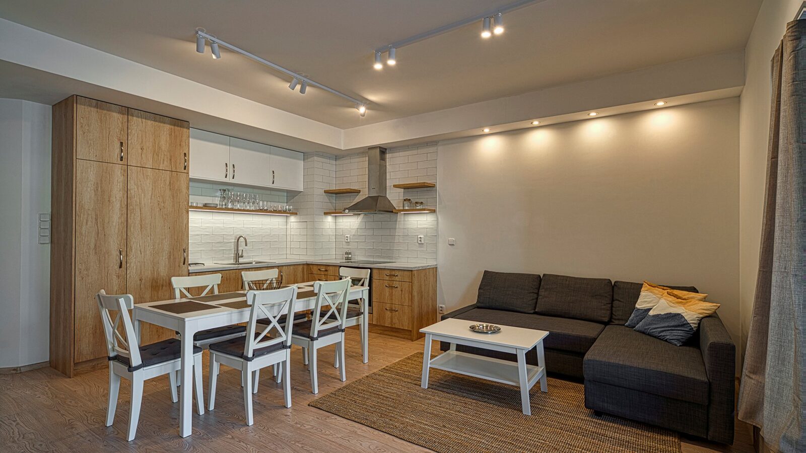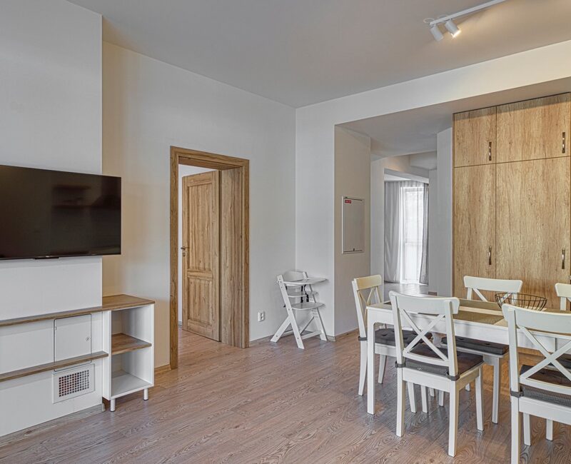 Apartmán JEDĽA, ktorý sa nachádza na 2. poschodí apartmánového domu, je ideálny pre 6 dospelých osôb. Súčasťou apartmánu je spálňa, izba s 2 jednolôžkovými posteľami, ktoré je možné rozložiť na 2 samostatné postele, obývacia miestnosť s kuchyňou a kúpeľňa. Obývacia časť je vybavená TV, sedacou súpravou, jedálenským stolom a je prepojená s plne vybavenou kuchyňou, ktorá obsahuje varnú dosku, elektrickú rúru, chladničku, varnú kanvicu a umývačku riadu. Apartmán je vybavený terasou s výhľadom na štíty Vysokých Tatier a neobsahuje krb.