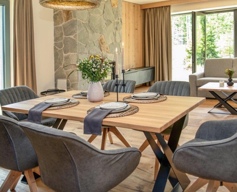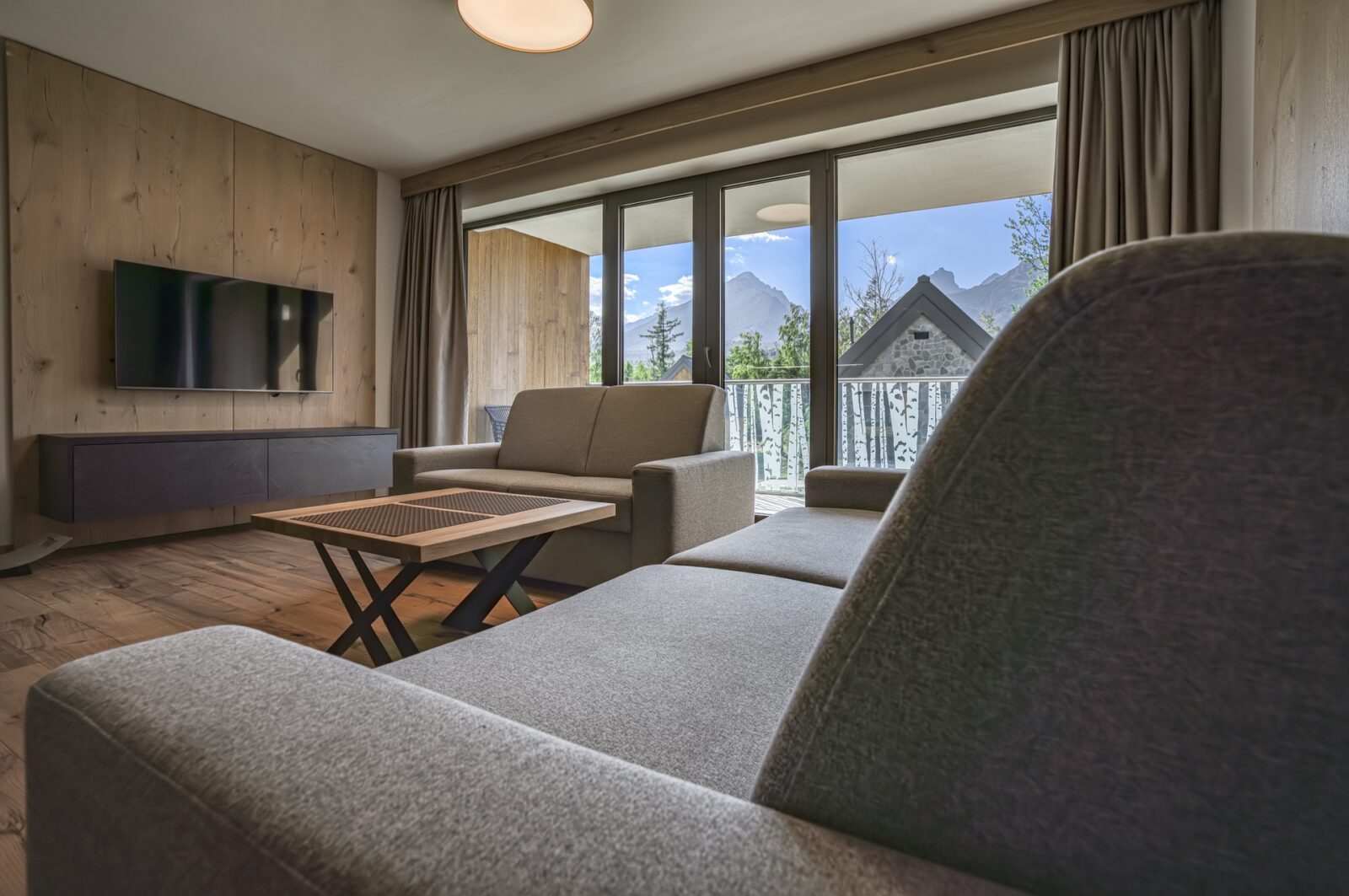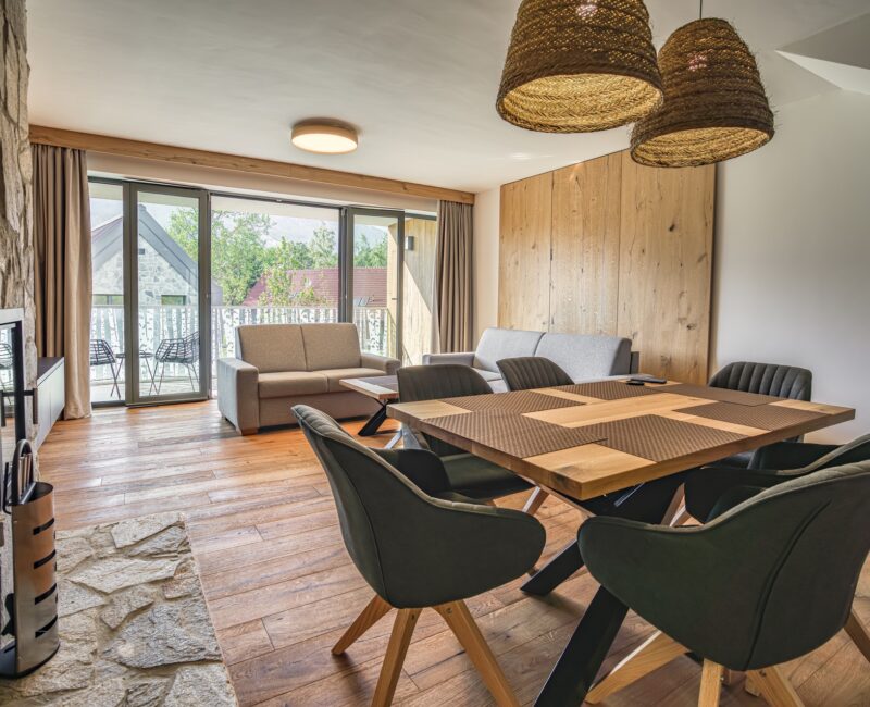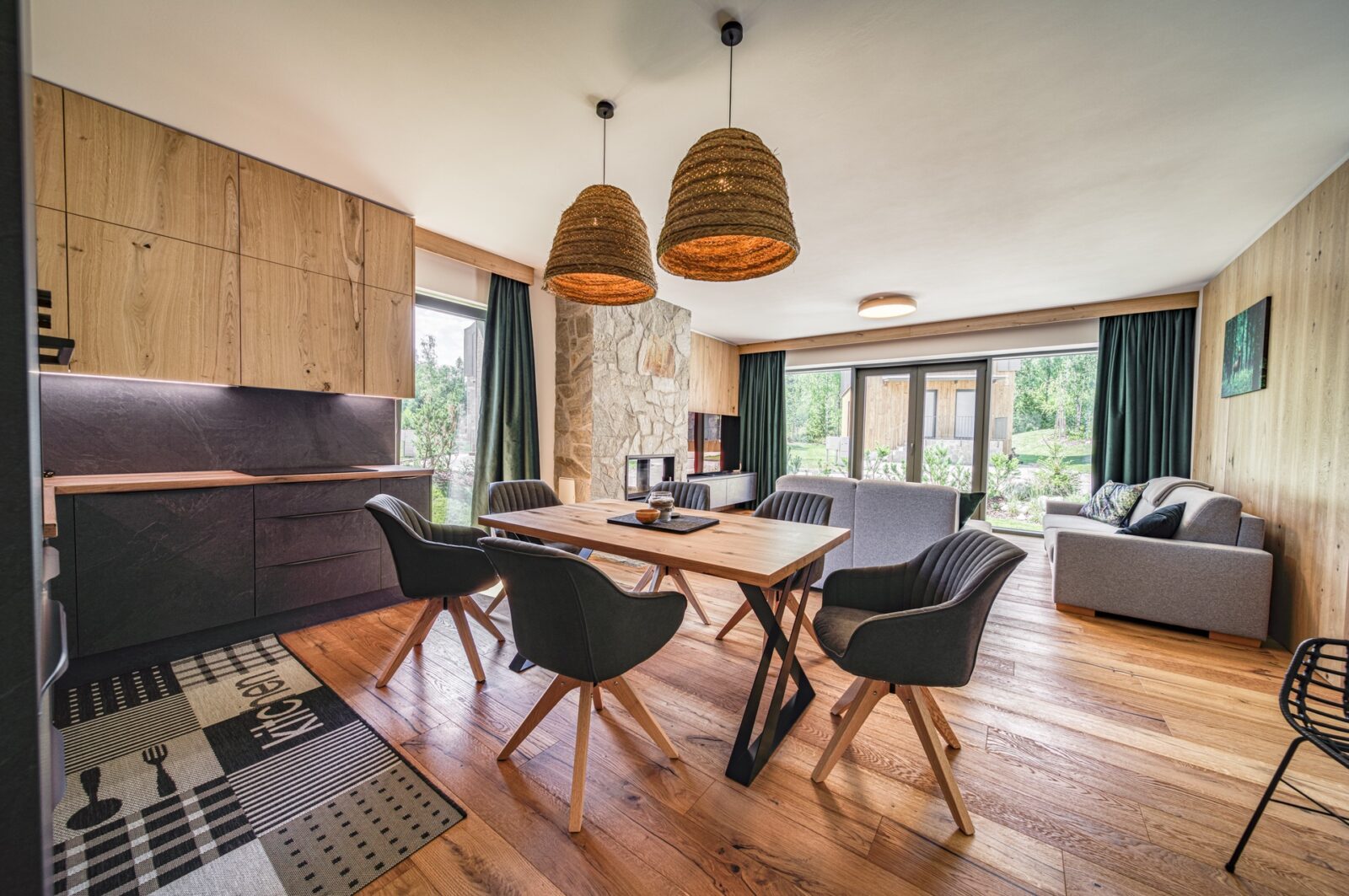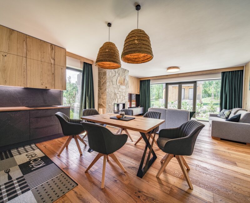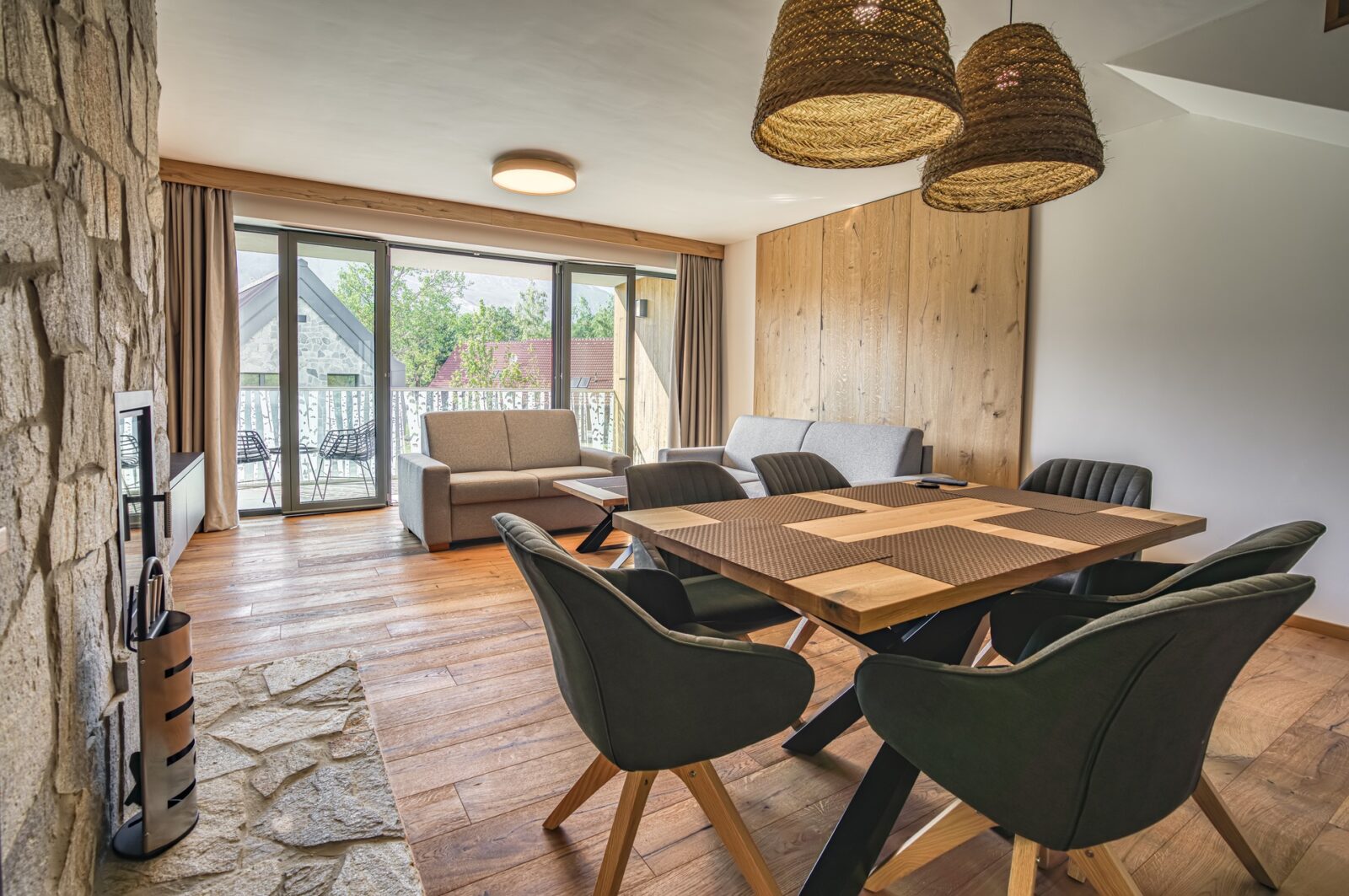 Mezonetové apartmány sa nachádzajú v brezovom háji, ktorý sú súčasťou areálu a rezortu hotela Horizont Resort, ktoré sú ideálne pre skupiny priateľov, početné rodiny alebo kolektívy. Tieto apartmány s modernou architektúrou a atraktívnou polohou ponúkajú komfortné ubytovanie pre 6 až 8 osôb. Na prízemí sa nachádza obývacia miestnosť s TV, krbom a jedálenským stolom, prepojená s plne vybavenou kuchyňou s rúrou, keramickou varnou doskou, chladničkou, varnou kanvicou a umývačkou riadu. Z obývacej miestnosti je východ na balkón s výhľadom na okolitú prírodu. Na poschodí sú tri oddelené a moderne zariadené spálne: jedna s manželskou posteľou a možnosťou pridania detskej postieľky a dve s oddelenými lôžkami a francúzskymi oknami. Apartmány sú vybavené aj technickou miestnosťou s práčovňou, šatníkom a skladom. V celom objekte je dostupné bezplatné Wi-Fi pripojenie na internet. K dispozícii je lyžiareň s ozónovým sušením v hlavnej budove hotela, bezplatné súkromné parkovisko, areál s detským ihriskom a jazierkom.